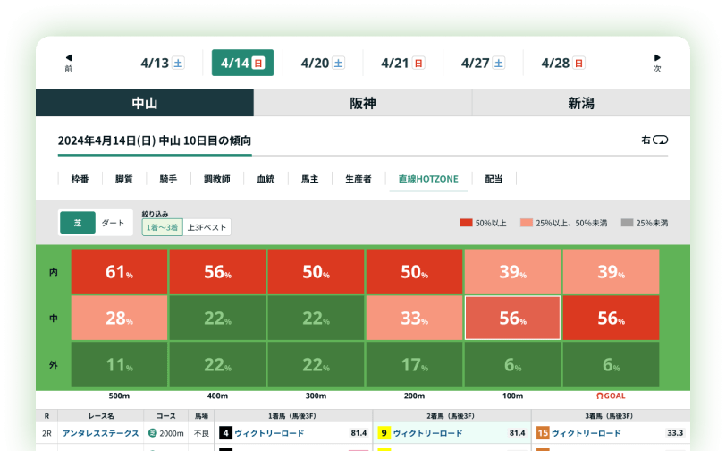 直線HOTZONE、タイム評価分析など、独自のデータを配信。レース当日の各馬の走行ルートや過去のレース結果を徹底分析し、SPAIA競馬有料会員だけに全レース見放題で公開。レース結果をさらに理解するための、一歩踏み込んだ情報をお届けします!