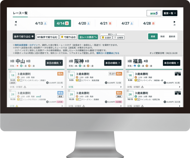 レース一覧、近走成績、データ分析、過去10年など情報量が多いページに条件絞り込み機能を搭載。欲しい情報を見つけ出し、効率よく分析可能に。自分の予想スタイルに合わせてデータを活用し、目指せ的中率アップ!