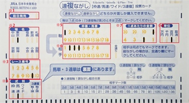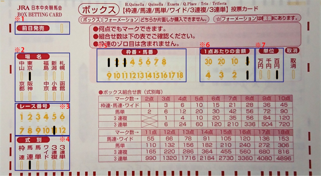 (例)「1つの箱に複数マークすることが可能です。例えば、1着に1、2番、2着に1、2、3番、3着に1、2、3、4番の3連単を買いたければ、※5に、1・2、※6に1・2・3、※7に1・2・3・4を塗ればできあがり。こちらは青いカードと比べると分かりやすく便利です。