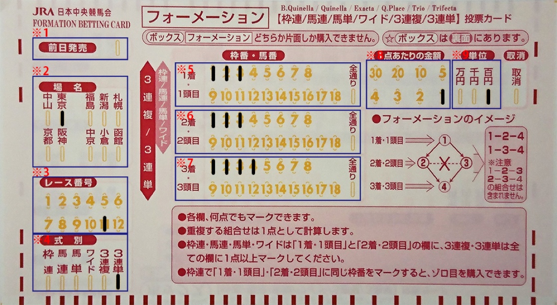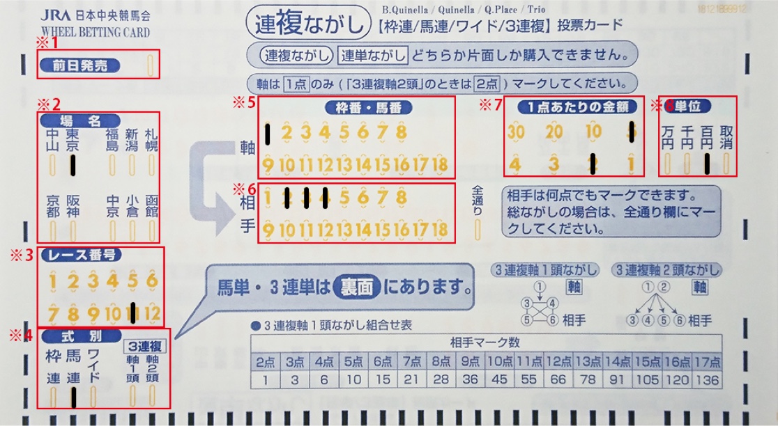 (例)1-2-3の3連単の馬券を買う時は、※5に1、※6に2、※7に3をマークします。