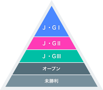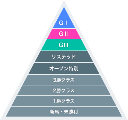 平地競走のレースは上から順に下記の9つのクラスに分かれています。 このクラスは「収得賞金(※1)」により決められます。 基本は1勝するごとに1つ上のクラスに上がって行きますが、重賞で2着に入ったり、格上挑戦して勝った時など 例外もあります。