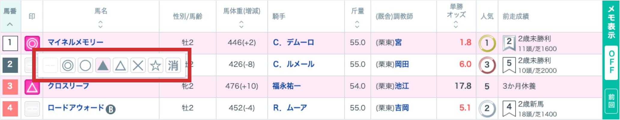 全レースの出馬表・AI予想・近走成績ページで予想印を入力できる機能です。
