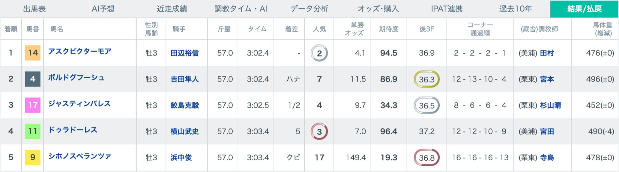 レース着順を配信。単勝オッズとレース発走前の期待度もあわせて表示します。レース終了後は、ペース予想・荒れ予想のAI判定結果も公開します。