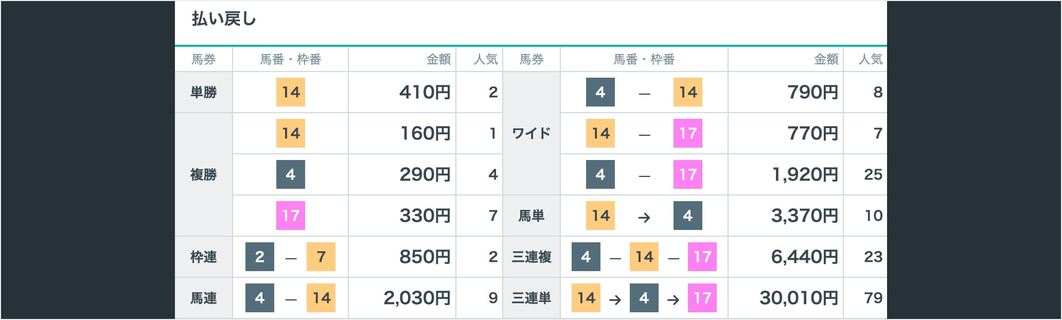 券種ごとの払戻金(配当金)を表示しています。