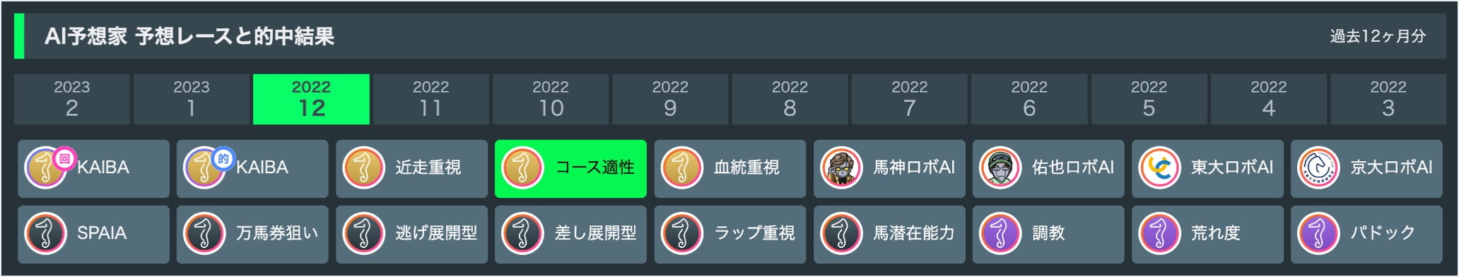 過去12ヶ月分のデータを表示。月別・AI予想家別にデータの絞り込みができます。どのAI予想家が多く的中しているかを参考いただけます。