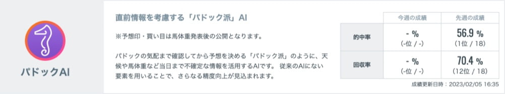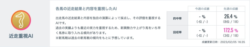 AI予想家の特徴紹介とともに中央競馬の今週と先週の的中率・回収率実績も公開しています。