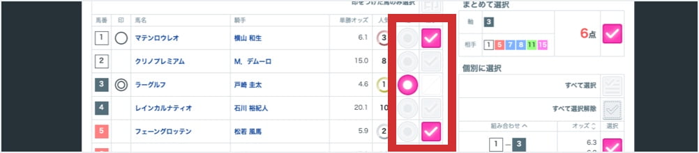 予想印やオッズ・人気などを参考に組み合わせを選択