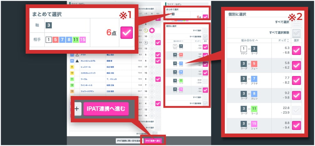 選択した買い目の金額入力に進む場合は下部の[IPAT連携へ進む]ボタンを押してください。
