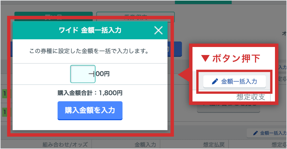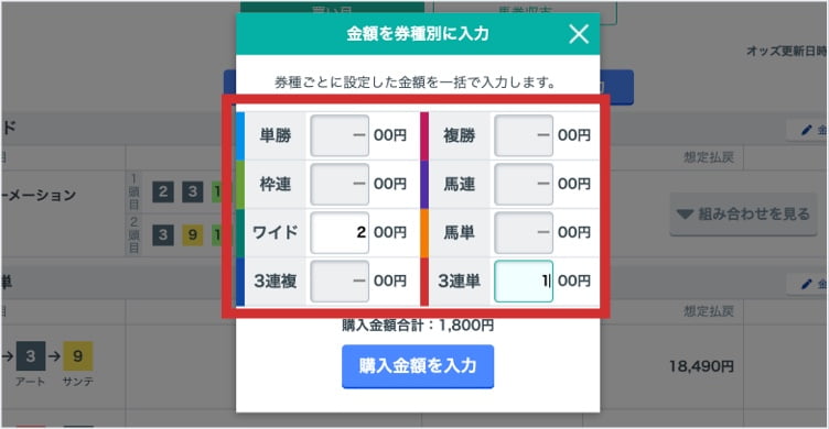 オッズ・購入画面で選択した買い目投票データをJRAのIPATに送信できる機能。購入金額の入力もこの画面で行うことができます。マイナスの想定収支は赤字で表示されますので、買い目の削除や資金分配にお役立てください。