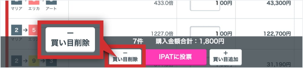 IPAT連携画面に追加した買い目を編集(追加・削除)できます。
