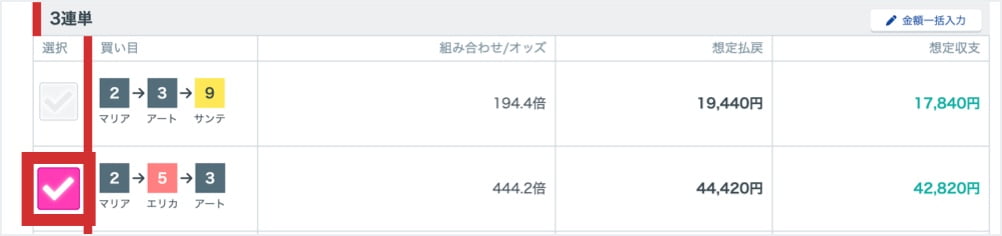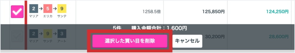 左端の選択欄のチェックボックスを押下して削除したい買い目を選択
