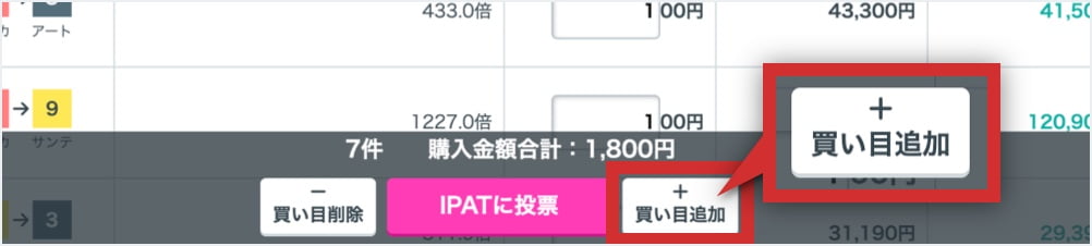 [買い目追加]ボタンでオッズ・購入画面から再度、追加したい買い目を選択してください。
