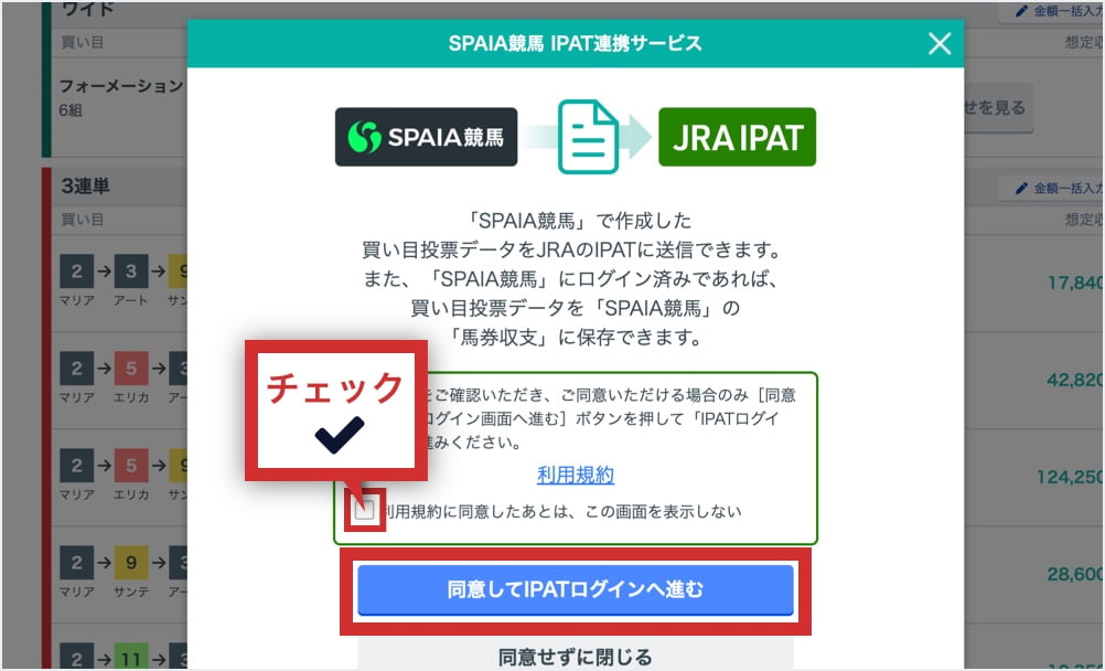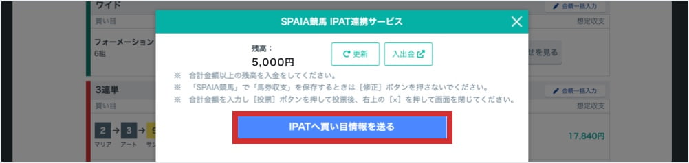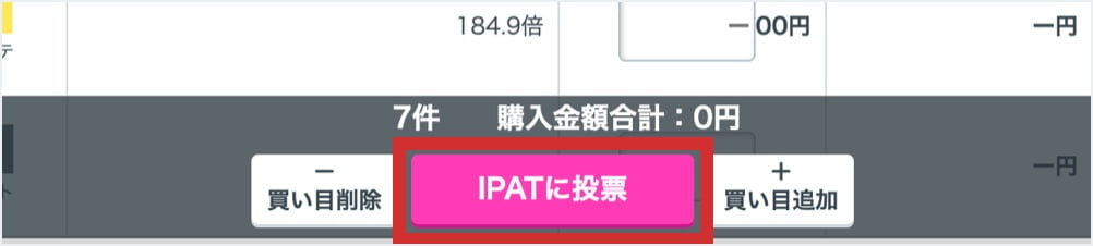 ※ IPAT上で追加・削除した買い目は、SPAIA競馬の馬券収支に保存することができません。IPAT側での買い目追加・削除をSPAIA競馬の馬券収支に反映したい場合は手動での追加・削除を行う必要があります。詳しくは下記をご参考ください。