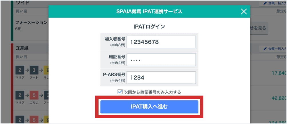 IPATログイン情報入力後、[IPAT購入へ進む]ボタンを押下します。