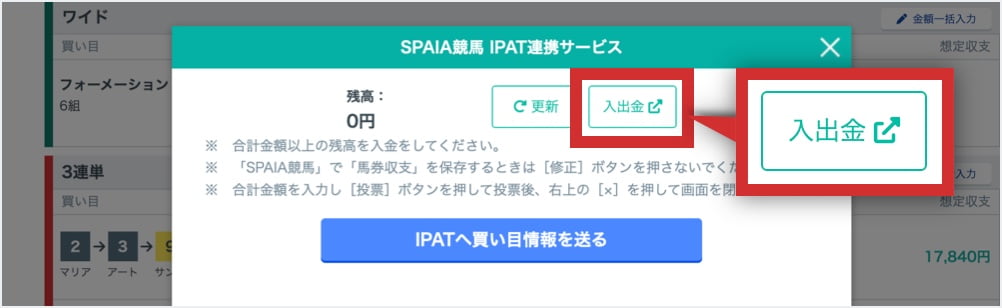 入出金後、SPAIA競馬 IPAT連携サービス画面に戻り[更新]ボタンを押していただくと残高が更新されます。