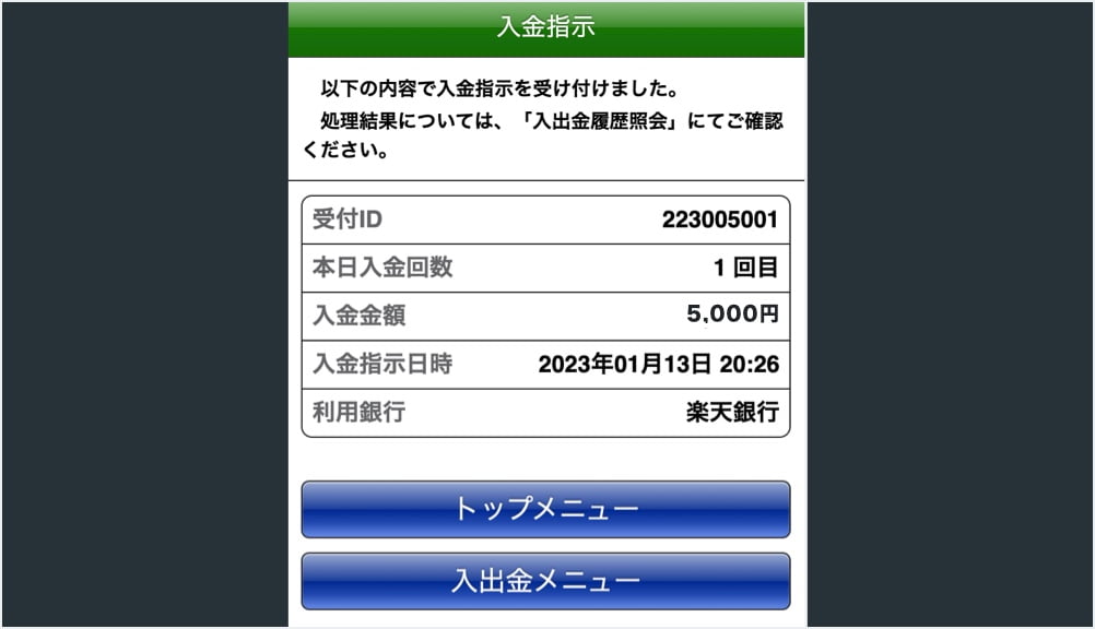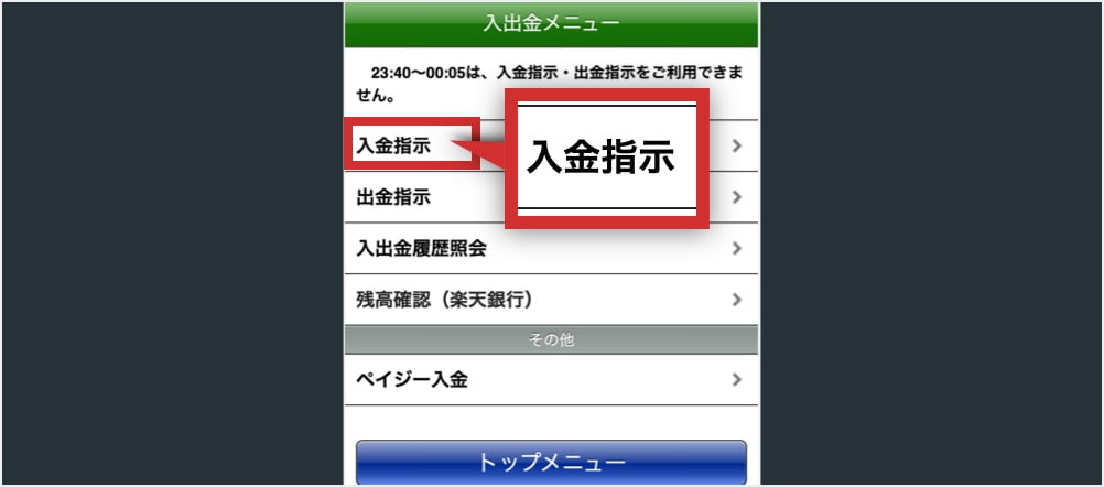 残高不足で入金が必要な場合は[入出金]ボタンを押下し、下記の手順で入金を行います。