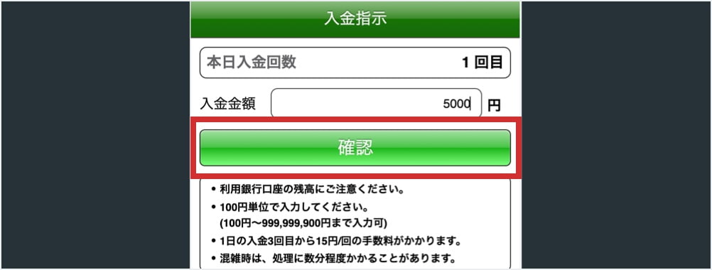 入金指示画面でフォームに入金金額を入力後[確認]ボタンを押下