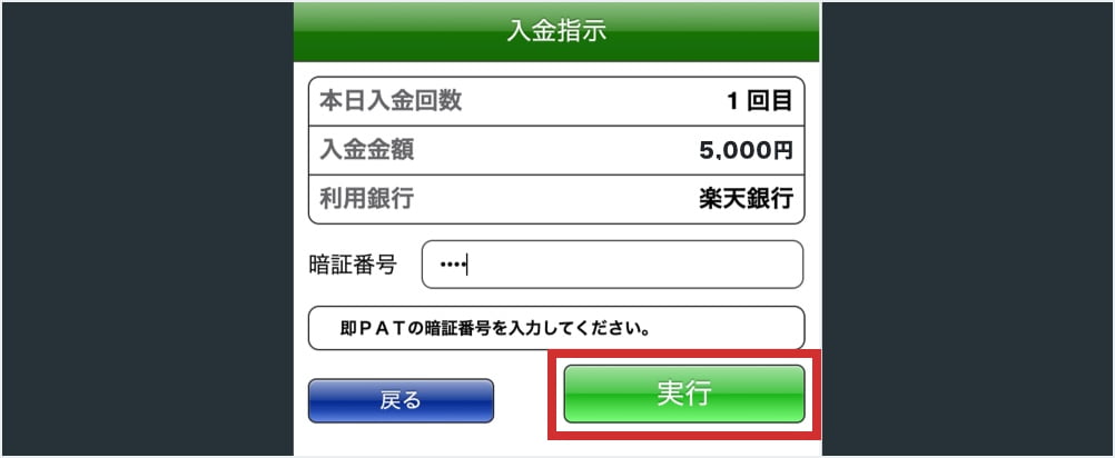 確認画面でフォームに暗証番号を入力後[実行]ボタンを押下