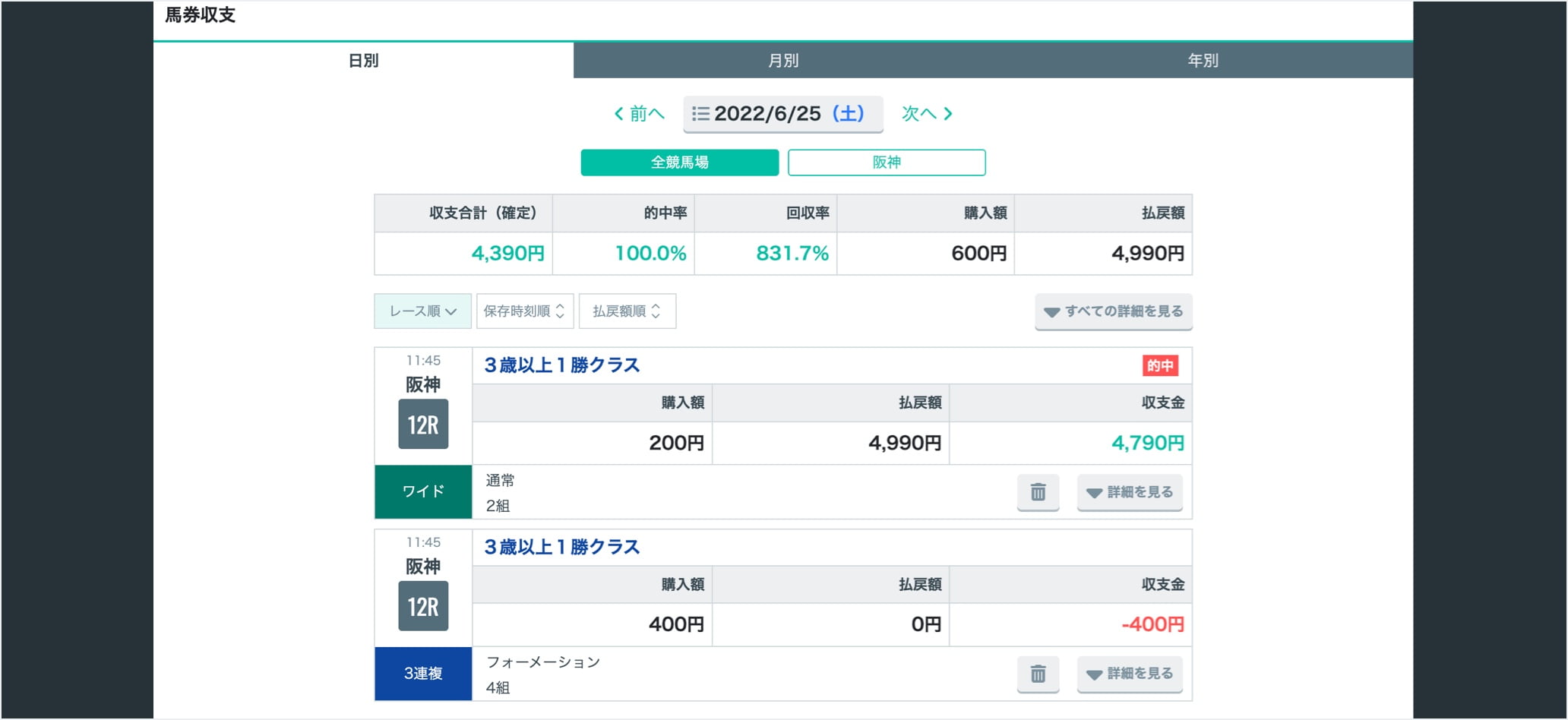 日別・月別・年別で収支合計や的中率、回収率を確認できます。