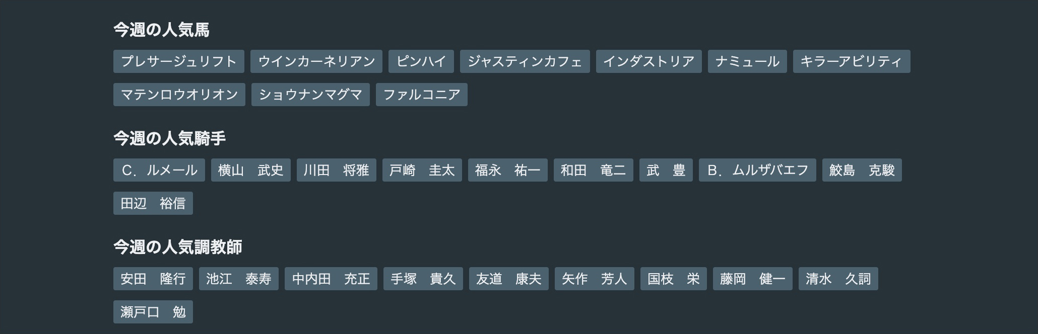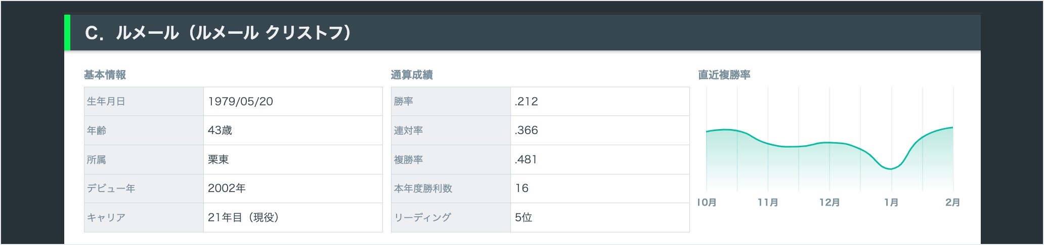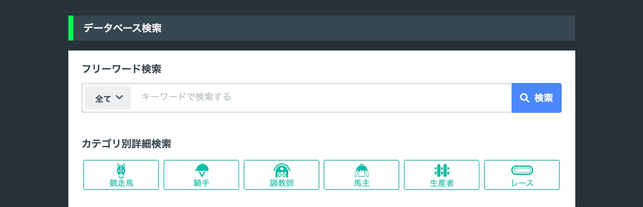 競走馬・騎手・調教師・馬主・生産者・レースに関する情報を検索できます。