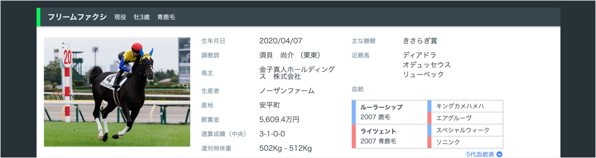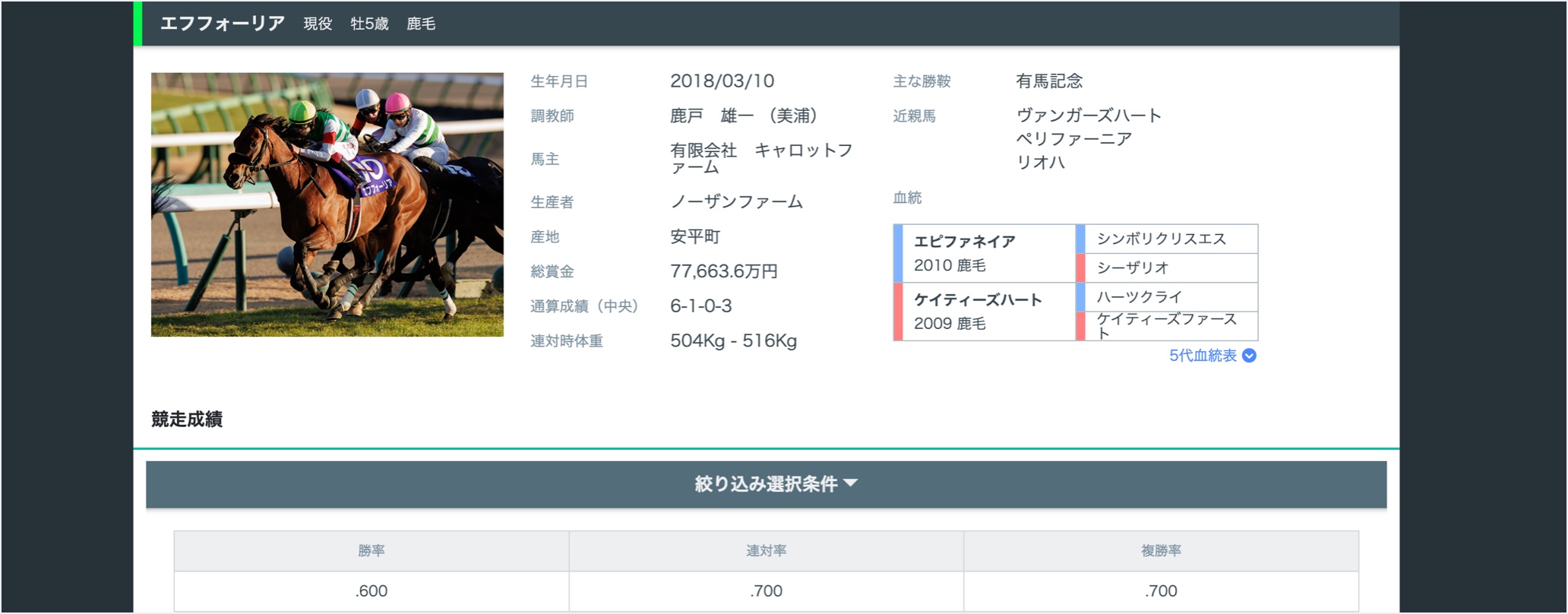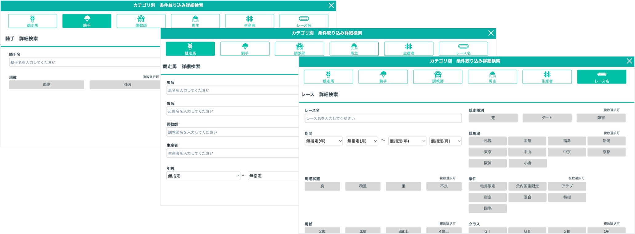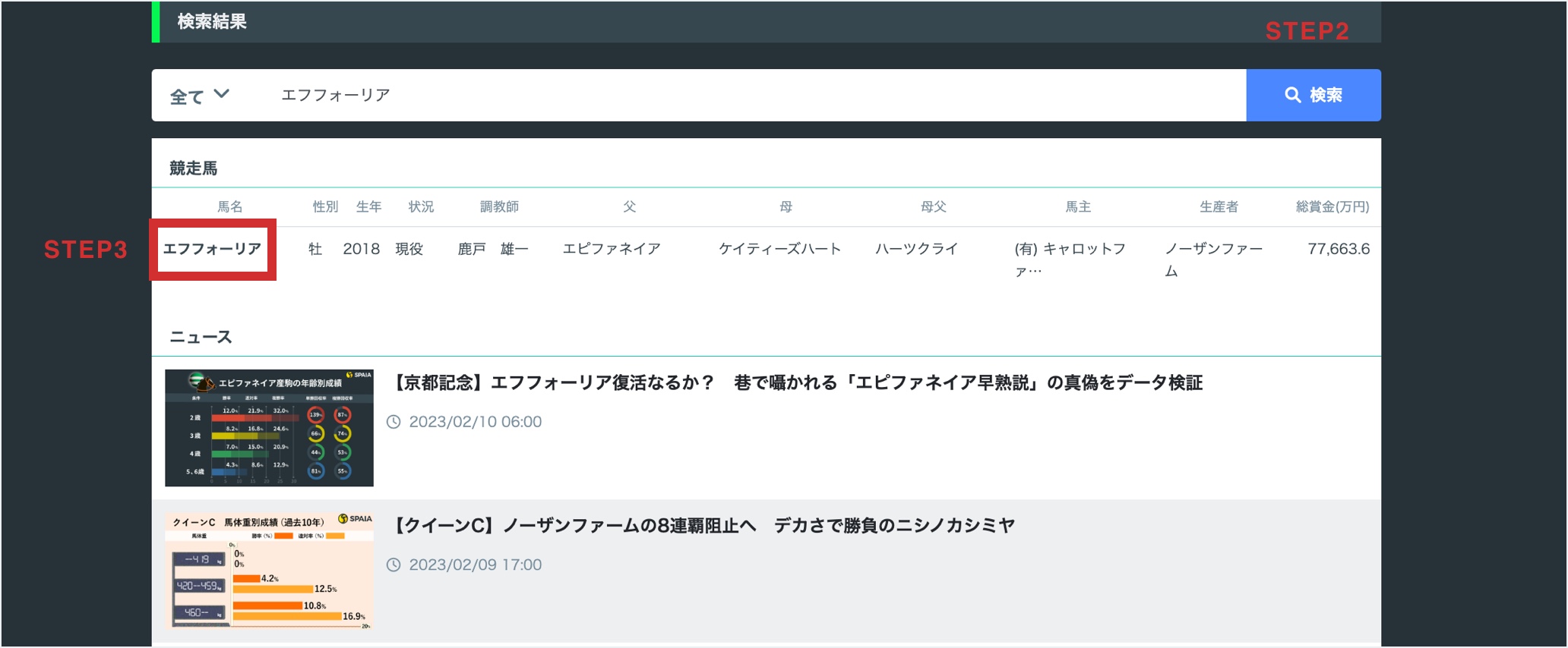 フリーワード検索では検索ワードに関連する全てのカテゴリの検索結果を一覧で表示しています。検索結果の項目を押下いただくことで出走・騎乗成績など、より詳細な情報を確認できます。