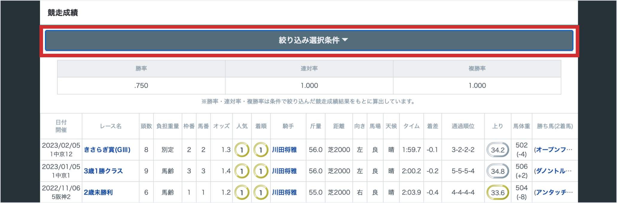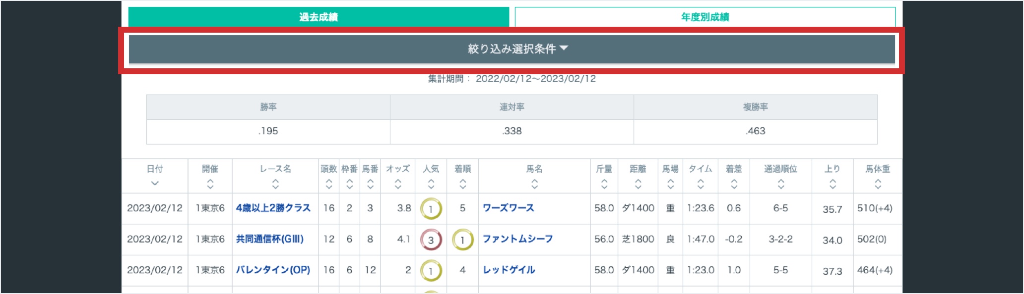 プラチナ・ダイヤモンド会員限定で競走馬成績データの条件絞り込みが可能です。
