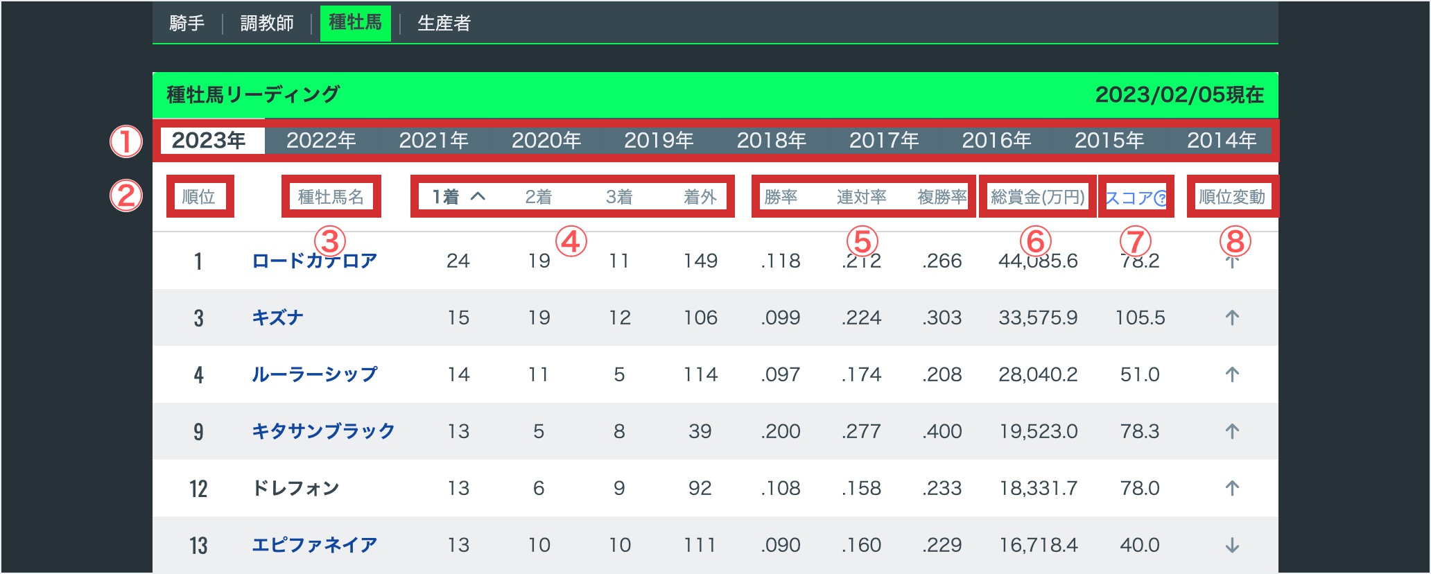 詳細ページでは騎手・調教師・種牡馬・生産者の各順位データをすべて表示。年代別での切り替えが可能。順位や1〜3着数等の各項目でデータを昇降順表示することができます。