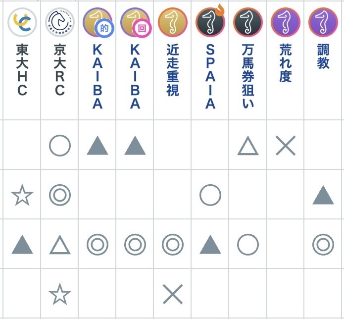 穴(可能性は低いが、実力を発揮できれば馬券圏内が見込める馬。東大ホースメンクラブ、京都大学競馬研究会のみ表示) |